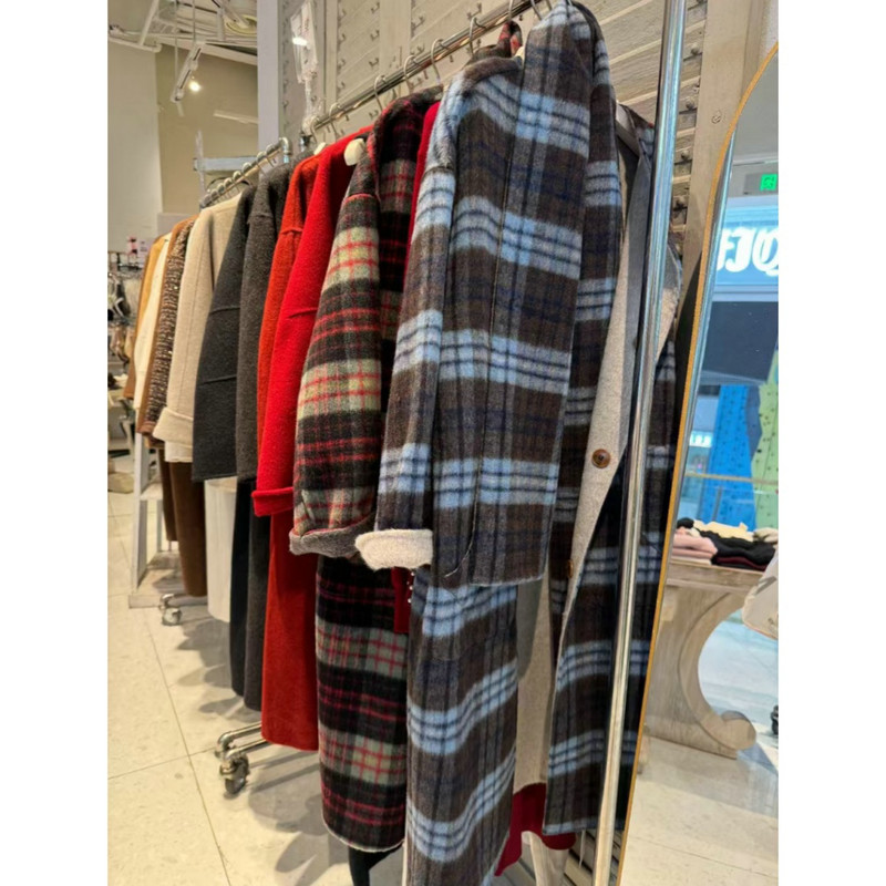 商品 ZZH25004 として指定されるこの生地は、ウール 50% とその他の繊維 50% で構成される厚手の織物です。単位面積あたりの質量が 950g/m で、この素材はかなりの密度と厚みを示します。表面にはピンク、ブラウン、ホワイトのトーンを組み合わせたチェック柄が構造的な格子状に施されています。この重量仕様は、生地の防風性と断熱能力に貢献します。ウールブレンドの組成は、テキスタイルの温度調節特性に影響を与えます。これらの技術的パラメータにより、この織物は低温からの十分な保護が必要な冬のオーバーコートに適用できるようになります。
