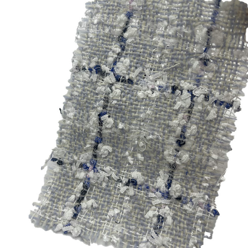 商品番号 23510 として指定されるこの生地は、ウール 45% とポリエステル 55% で構成されるツイード生地です。単位面積あたりの質量が 425 gsm で、コートに適した中程度の重量の構造を示します。生地にはブルー、グレー、ホワイトのチェック柄が特徴で、織りの過程で蝶のモチーフが組み込まれています。この組み合わせにより、テキスタイル構造内に層状の視覚効果が生まれます。ウールとポリエステルの混紡は、生地の寸法安定性と保温特性に貢献します。これらの技術的特性により、このツイードはパターンの複雑さと構造の完全性が必要とされるアウターウェアに適用できます。