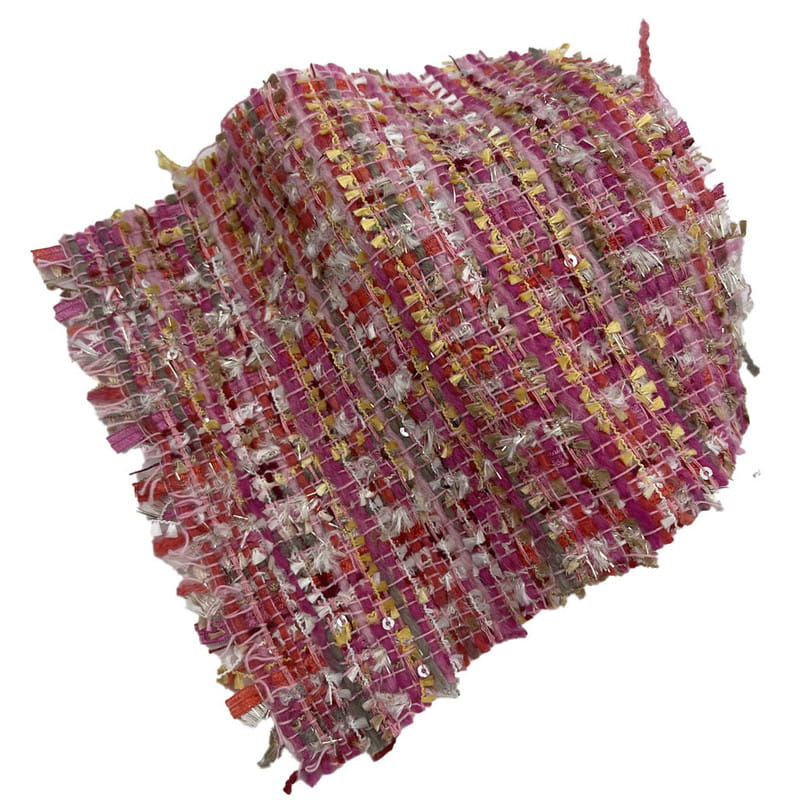 この生地は、商品番号 21003 として指定されており、ポリエステル 67% とアクリル 33% で構成されるツイード生地です。単位面積あたりの質量が 385 gsm で、中程度の重量の構造です。この生地には、金属糸と組み合わせた赤とピンクのスパンコールが組み込まれており、分散反射面を作成するために製織プロセス中に一体化されています。ポリエステルベースは構造安定性を提供し、アクリル成分は生地のかさ高さと質感に貢献します。この組み合わせにより、さまざまな光反射と表面の次元性を備えた素材が得られます。これらの技術的特性により、このツイードは装飾的な要素と構造的完全性が必要とされる婦人服に適用できます。