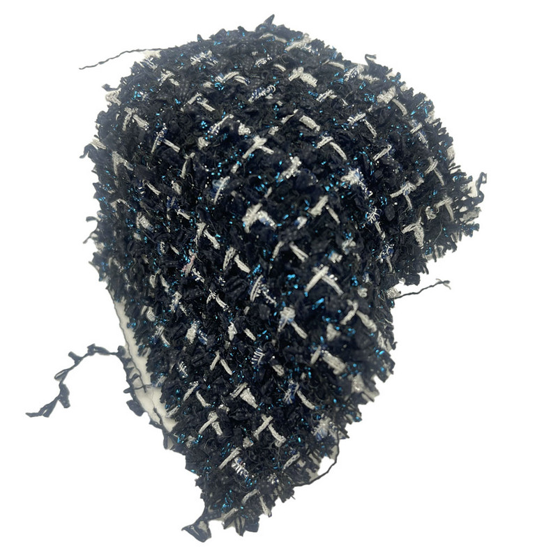 商品番号 23511 として指定されているこの生地は、ポリエステル 86% とナイロン 14% で構成されるチェック ツイード生地です。単位面積あたりの質量が 340 gsm で、軽量な構造です。ダークブルーをベースにチェック柄の中にブルーのメタリック糸を織り込み、光の反射の変化によりコントラストのある視覚効果を生み出しています。ポリエステルとナイロンのブレンドにより、寸法安定性と構造の一貫性が実現します。金属要素を含めることで、織物の表面に光と相互作用する特性が追加されます。これらの技術仕様により、このツイード生地は、明確なパターンの表現と微妙な表面の変化が必要な婦人服に適用できるようになります。