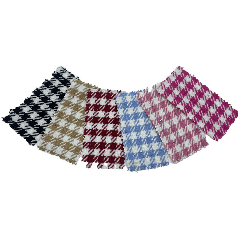 物品 3741 として指定されるこの生地は、10% のウールと 90% のその他の繊維で構成されるツイル織物です。単位面積あたりの質量は 550 g/m で、重量感のある構造です。表面はツイル織り組織に組み込まれたマルチカラーのチェックパターンが特徴で、グリッドの下に斜めのラインを作り出します。この製造技術により、交差するカラーバンドと特徴的なツイルテクスチャーを持つ生地が生まれます。ウールブレンド組成は、素材の弾力性と保温性に貢献します。これらの技術的特性により、このツイル生地はパターンの視認性と構造的耐久性が必要とされるホームテキスタイルに適用できます。