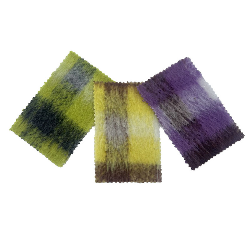 この生地は、商品 3256 として指定されており、ウール 20% とその他の繊維 80% で構成されるツイード生地です。単位面積あたりの質量は 700 g/m で、重量感のある構造です。パープルの表面には、長いパイルのテクスチャーと統合されたチェック柄が特徴で、特殊な織りと仕上げのプロセスを通じて複合構造を作り出しています。この製造技術により、表面の繊維長が長くなり、顕著な立体感が生まれます。ウールブレンド組成は、生地の断熱特性と構造上の弾力性に貢献します。これらの技術的特性により、かなりのボリュームと表面の深さを備えた素材が得られ、高い暖かさと質感の存在感が必要なオーバーコートに適用できます。