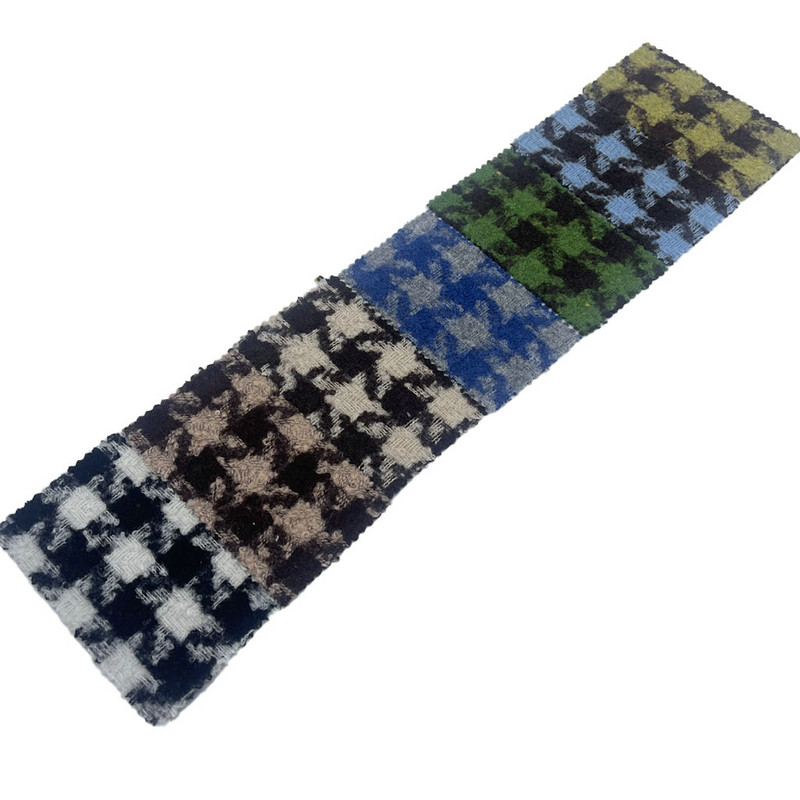 この生地は、商品番号 2882 として指定されており、ウール 10% とその他の繊維 90% で構成されるジャカード ツイード生地です。単位面積あたりの質量は600g/mで、重量感のある構造です。表面は千鳥格子柄とチェック柄をジャカード織りで組み合わせています。起毛加工を施し、テディのような起毛感を出し、高密度で毛足の短い表面を形成しています。この技術は、織りパターンの幾何学的精度を維持しながら、生地の視覚的な奥行きと触感特性の両方を変更します。ウールブレンド組成は、素材の弾力性と断熱性に貢献します。これらの技術的特性により、この生地は複雑なパターン定義と独特の表面テクスチャーの両方を必要とするプロジェクトに適用できます。