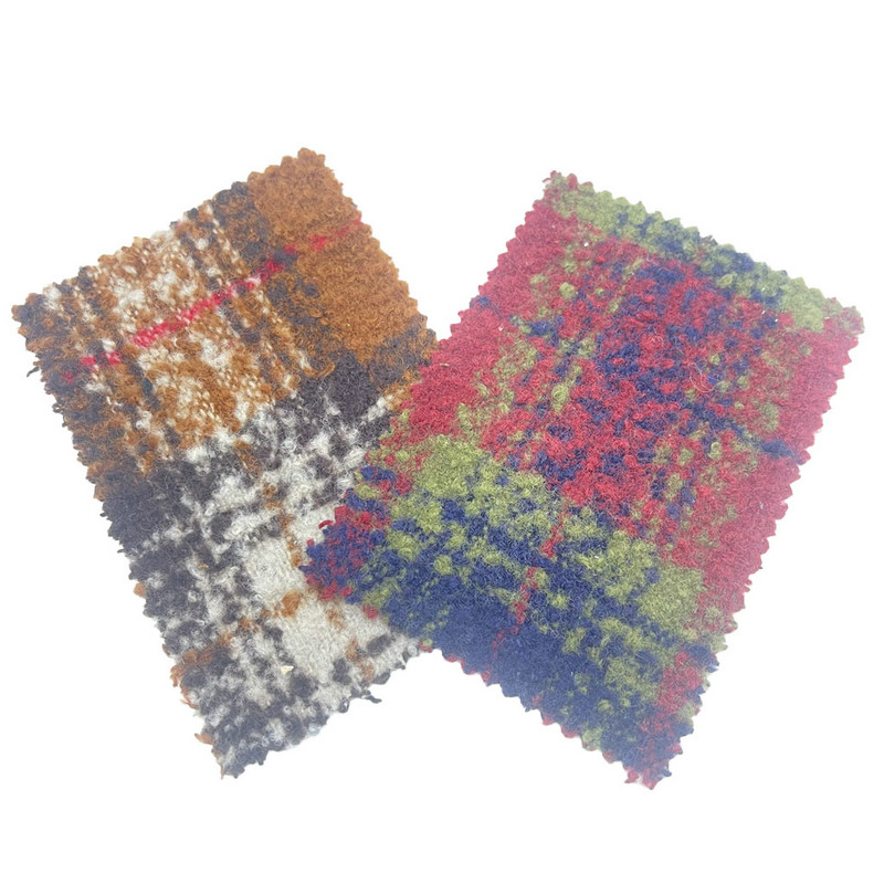 この生地は、商品番号 3851 として指定されており、ウール 10% とその他の繊維 90% で構成されるジャカード ツイード生地です。単位面積あたりの質量は 520 g/m で、中重量から重量の構造を示します。表面には、ジャカード織りプロセスによって作成されたタータンチェック柄が特徴で、カラーストライプが正確に交差しています。テディベアのような起毛加工を施し、生地の表面特性を変化させています。この技術により、視覚的な奥行きと触感特性の両方を変更する、高密度で毛足の短い表面が得られます。技術仕様により、この生地は、明確なパターンの表現と独特の表面テクスチャーが必要なジャケットの製造に適用できます。